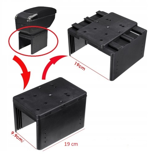 Podłokietnik uniwersalny, pasujący do większości modeli samochodów (gdzie szerokość tunelu środkowego waha się pomiędzy 10, a 19 cm)