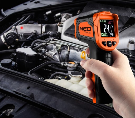 Przyrząd do szacowania temperatury (pirometr) NEO (nr ref. 75-276) służy do pomiaru temperatury powierzchni obiekt z dokładnością do +/- 1,5%+1 °C w zakresie -50 880 °C. Może być używany do szacowania temperatury różnych, gorących, niebezpiecznych lub trudno dostępnych obiektów bez kontaktu. To urządzenie składa się z optyki, czujnika temperatury, w jego skład wchodzi wzmacniacz sygnału, obwód przetwarzania i wyświetlacz LCD. Optyka zbiera energię podczerwoną emitowaną przez obiekt i skupia ją na czujniku. Czujnik zamienia energię na sygnał elektryczny, a ten jest wyświetlony jako odczyt cyfrowy. Urządzenie działa bezdotykowo. Pomiar dokonywany jest w stopniach Celsjusza lub Fahrenheita, a jego wynik wyświetlany na kolorowym wyświetlaczu LCD. Pirometr zasilany jest dwoma bateriami AAA. Urządzenie nie jest wyrobem medycznym