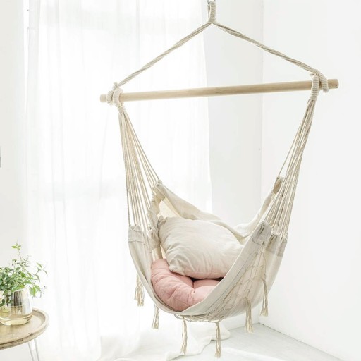 65 % bawełny zapewnia prawidłową wentylację, co wpływa komfort korzystania z wiszącego fotela nawet w upalne dni. 35% domieszka poliestru odpowiada za wytrzymałość siedziska. Solidne kółko montażowe połączone jest z wytrzymałymi linami, równomiernie rozprowadzonymi po bokach hamaka przez drewnianą poprzeczkę. Taka konstrukcja sprawia, że całość łatwo powiesić, a ponadto hamak jest dobrze wyważony i stabilny.