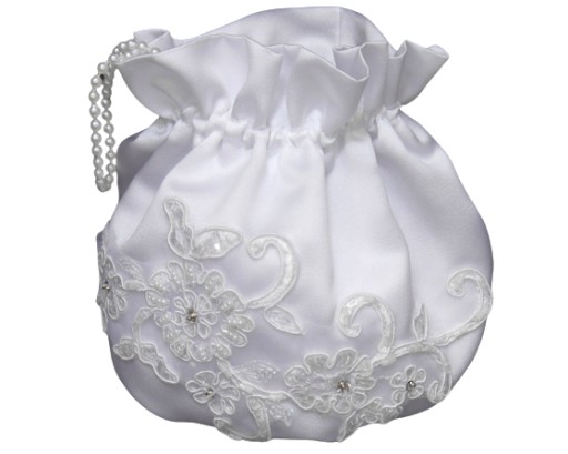 Torebka komunijna w kształcie woreczka z satyny ślubnej pierwszego gatunku. Torebka ozdobiona została opalizującą koronkową aplikacją. Posiada wkładkę pomagającą w zachowaniu kształty woreczka nawet po obciążeniu. Na pozostałych aukcjach można do niej dopasować np. rękawiczki lub okapnik na świece komunijne. Dostępna jest również torebka prostokątna typu ( kopertówka )