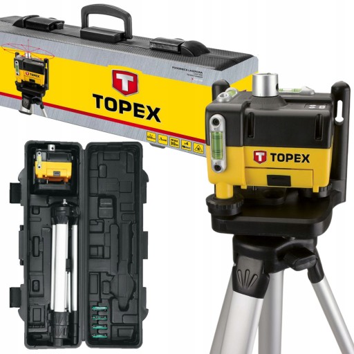 Poziomnica laserowa obrotowa, statyw, okulary, wyznaczanie płaszczyzny pionowej, wyznaczanie płaszczyzny poziomej, prędkość obrotowa wirowania do 500 obr./min, długość fali lasera 650 nm, klasa II, moc lasera 1 mW, zasilanie: 4 baterie AA, zasięg do 30 m, masa 4.5 kg, walizka