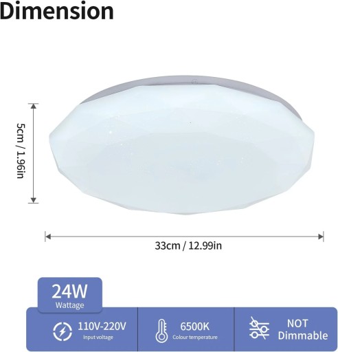 Rozmiar lamp sufitowych do 33*33*5 cm (13*13*2 cale), temperatura barwowa do chłodnego białego światła 6000 K, moc 24 W, powierzchnia ma zastosowanie w obszarach przestrzeni rombu. Delikatna, diamentowa faktura klosza daje wspaniały efekt gwiaździsty, umożliwiający, że jest dostępny jak w morzu gwiazd, dodając urok Twojemu pomieszczeniu. urządzenie od tego, czy jest to pokój w stylu funkcjonalnym, czy pokój dziecięcy, można łatwo przejść.
