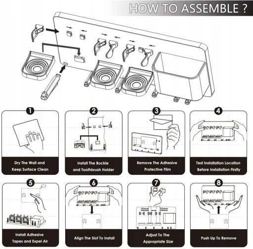 4 OPISY FUNKCJI: ① UCHWYT NA SZCZOTECZKĘ - 3 miejsca na szczoteczkę elektryczną, pastę do zębów, płyn do demakijażu lub golarkę ② ORGANIZER PUDEŁKO-grzebień do przechowywania puszek, spinka do włosów, ręczna szczoteczka do zębów, końcówka do szczoteczki elektrycznej, golarka elektryczna, golarka ręczna, pędzel do makijażu, eyeliner, pasta do zębów ③ CZTERY HACZYKI Z BLOKIEM ZABEZPIECZAJĄCYM - Do mycia można powiesić opaski do włosów, piłki do kąpieli, naszyjniki, zegarki, szczotki czyszczące, pędzle do golenia, ręczniki DWA HACZYKI - do ręcznego uchwytu maszynki do golenia.