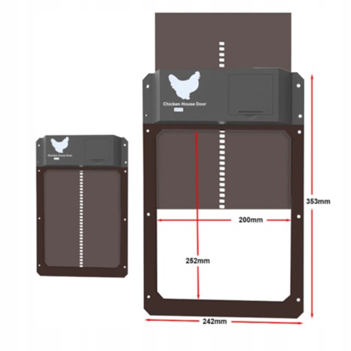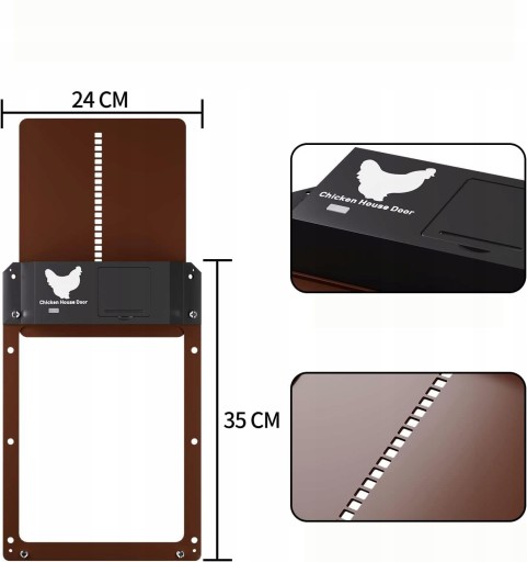 Rozmiar drzwiczek dla kurczaków wynosi 35 x 24 x 3,7 cm i mogą one pomieścić prawie wszystkie rozmiary kurczaków lub kaczek.