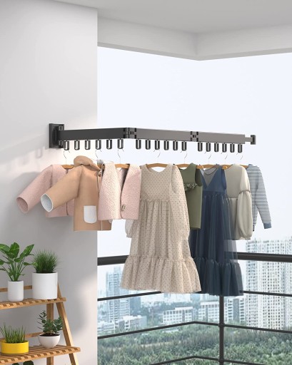 Nasz wysuwany wieszak do suszenia ubrań charakteryzuje się innowacyjną konstrukcją i matowym czarnym wykończeniem, co zapewnia elastyczność dostosowania długości wieszaka do ubrań w dowolnym momencie.