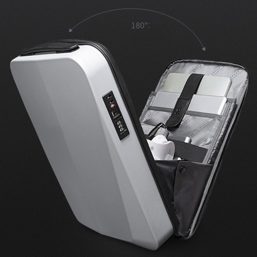 Plecak marki Bange o symbolu BG22201 to wyjątkowy, antykradzieżowy plecak typu kapsuła. Wykonany został z wodoodpornego materiału EVA, a główny zamek plecaka został dodatkowo zabezpieczony przed przemakaniem. Plecak w całości jest usztywniany, dzięki czemu doskonale chroni zawartość przed uderzeniami. Zapięcie głównej komory plecaka jest zabezpieczone zamkiem szyfrowym TSA lock. Plecak można otworzyć pod kątem 30 (zapięcie zabezpieczające na rzepy), 90 lub 180 (jak walizkę). Wewnątrz znajduje się sporo miejsca na rzeczy oraz kieszeń na laptopa w rozmiarze do 15,6, kieszeń na tablet do 10 (obie zapinane na elastyczny pasek z rzepem), dwie kieszenie na drobiazgi zapinane na zamek, dwie kieszenie na akcesoria (np. powerbank). Tył plecaka wyłożono oddychającymi, grubymi gąbkami, aby był wygodny przy dłuższym noszeniu. Szelki plecaka o ergonomicznym kształcie są solidnie uszyte i wyłożone miękkimi gąbkami, aby plecak dobrze układał się na ramionach nawet przy dużym obciążeniu. Na obu szelkach umieszczono pasek do zahaczenia okularów i kieszonkę na kartę. Plecak BANGE BG22092 polecamy osobom, które potrzebują małego, zgrabnego plecaka na laptopa, świetnie zabezpieczonego przed kradzieżą i deszczem.