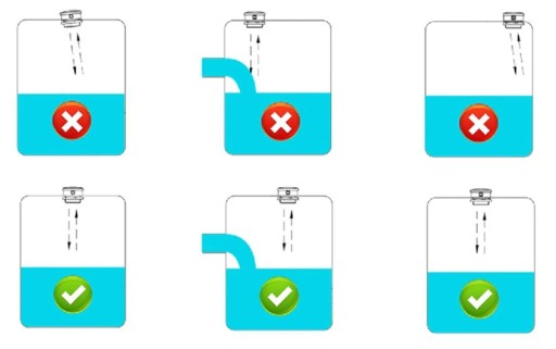 Czujnik powinien znajdować się na środku zbiornika. Należy zwrócić uwagę aby czujnik nie znajdował się na wlocie cieczy. To może zafałszować wynik pomiaru. Aby uzyskać najlepsze rezultaty, zapoznaj się z poniższymi zdjęciami. Otwór montażowy dla czujnika powinien mieć 72 mm.