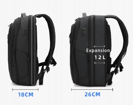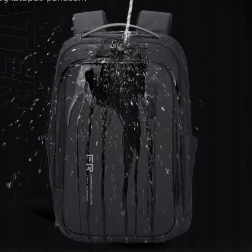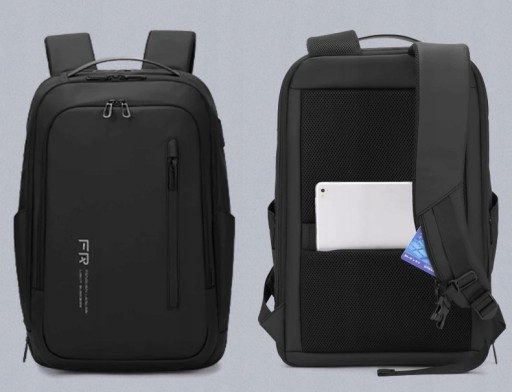 Dwukomorowy plecak na laptopa marki FRN o symbolu FRN8038 został wykonany z wodoodpornych i wytrzymałych materiałów – oxford i PVC. Komora z przodu plecaka otwierana jest na płasko, jak walizka. Znajduje się tutaj miejsce na zapakowanie ubrań, które odseparowane jest siatkową przegrodą, oraz dwie duże kieszenie. W drugiej komorze z tyłu plecaka znajduje się dedykowana, miękka kieszeń na laptopa w rozmiarze do 17,3" zapinana na rzep oraz sześć kieszonek na akcesoria. Z przodu plecaka znajduje się kieszeń na podręczne rzeczy z kieszonkami na akcesoria i długopisy oraz przypinką do kluczy, oraz druga mniejsza kieszeń z wodoodpornym zamkiem. Po bokach plecaka umieszczono kieszenie na napój lub parasolkę zapinane na zamek. Z lewej strony znajduje się zewnętrzne gniazdo USB, dzięki czemu nie ma konieczności wyciągania power banka z plecaka, aby naładować telefon lub inne przenośne urządzenie. Szelki plecaka o ergonomicznym kształcie oraz tylna ściana plecaka wyłożone są grubymi, oddychającymi gąbkami, dzięki czemu jest on wygodny przy dłuższym noszeniu. Plecak posiada również pas piersiowy, którym można spiąć szelki, aby lepiej rozłożyć ciężar przy maksymalnym zapakowaniu plecaka. Na tylnej ścianie umieszczono szeroki pas, dzięki któremu można założyć plecak na rączkę torby lotniczej, oraz bezpieczną kieszeń np. na telefon lub portfel. Plecak posiada uchwyt służący do przenoszenia plecaka w ręce. Niebywałą zaletą tego plecaka jest możliwość powiększenia go o dodatkowe 8cm (12l) poprzez rozpięcie dodatkowego zamka, biegnącego po całym obwodzie plecaka.