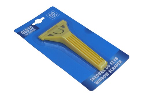 Skrobak wykonany z tworzywa w części czołowej umieszczone wymienne ostrze trapezowe o szerokości 60 mm. Ostrze posiada zakładaną osłonę.