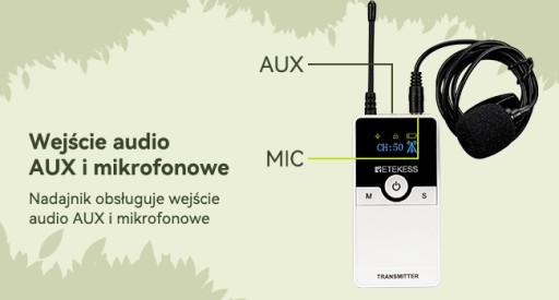 - Nadajnik ma gniazdo wejściowe 3,5 mm, obsługuje wejście AUX (np. MP3, smartfon, MP4, CD itp.) i wejście MIC (mikrofon)