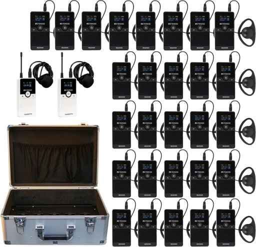Sprzęt montażowy: 2 x nadajnik bezprzewodowy 28 x odbiornik bezprzewodowy 2 x mikrofon Lavalier 28 x pojedyncze słuchawki 30 x smycz 30 x kabel USB do ładowania 1 x instrukcja obsługi 1 x Pudełko ładujące