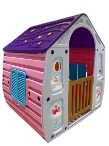 - Domek ozdobiony jest bajkowymi, kolorowymi obrazkami i atrakcyjnymi żłobieniami. Działa na wyobraźnię dzieci i inspiruje do kreatywnej zabawy.