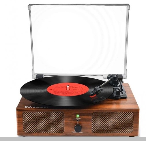 Gramofon UDREAMER UD001-Y posiada wbudowane głośniki stereo oraz technologię bezprzewodową Bluetooth. Użyj funkcji USB do bezpośredniego odtwarzania muzyki. Aby uzyskać lepszy lub głośniejszy dźwięk, podłącz głośnik zewnętrzny za pomocą kabla RCA.