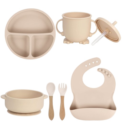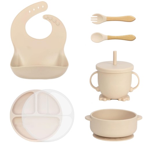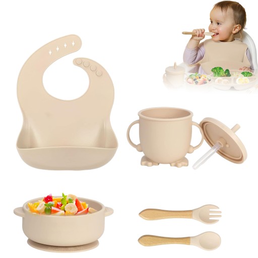 🌟 7-CZĘŚCIOWY ZESTAW SILIKONOWYCH ZASTAW STOŁOWYCH UZUPEŁNIAJĄCYCH ŻYWNOŚĆ (ŚLINIAK MAŁA PRZYSSAWKA SILIKONOWA POKRYWKA PODWÓJNE UCHO DREWNIANA ŁYŻKA WIDELEC KUBECZEK NIEKAPEK 150ML)