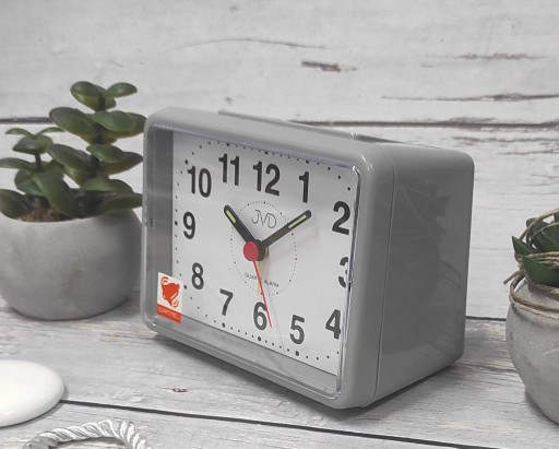 Duży czytelny szary budzik kwarcowy SR307.4 firmy JVD. Budzenie dźwiękiem mechanicznym - BELL ALARM. Podświetlenie. Mechanizm kwarcowy