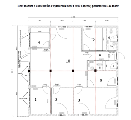 - wymiary poszczególnych kontenerów: 6000 x 3000 x 3000