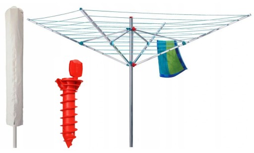 W komplecie znajduje się świder ziemny, który jest idealnym rozwiązaniem, aby w szybki sposób i w dowolnym miejscu zamontować suszarkę do podłoża bez konieczności betonowania. Wystarczy wkręcić ją w ziemię. Świder jest na tyle duży i masywny, że bez problemu utrzyma suszarkę w stabilnej pozycji, nawet podczas silnych wiatrów