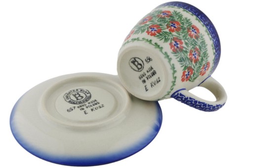Ręcznie zdobione filiżanki i podstawki wytwarzane przy użyciu tradycyjnej bolesławieckiej metody zdobienia stemplami oraz pędzlami.