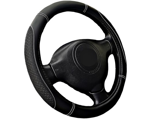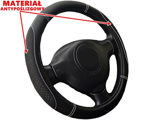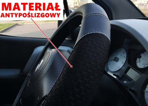 Pokrowiec na kierownicę z wysokiej jakości materiałów (ekoskóra połączona z materiałem antypoślizgowym).