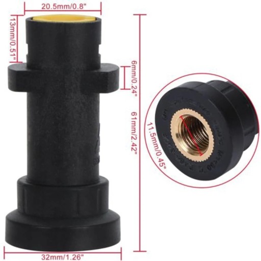 Zastosowanie: Adapter jest uniwersalny dla myjek Kärcher serii K oraz innych urządzeń z takim samym przyłączem. Idealny dla osób szukających wygodnego i niezawodnego rozwiązania do rozbudowy swojego sprzętu myjącego.