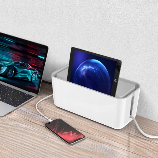 Organizer jest zamykany profilowaną pokrywką, która pełni rolę podstawki na tablet, smartfon czy inne cienkie urządzenie. To praktyczne rozwiązanie doskonale sprawdza się, kiedy chcesz podładować swoje urządzenie, jednocześnie z niego korzystając, np. oglądając film. Proces ładowania umożliwia sześć otworów umieszczonych w nakładce. Pojemnik o długości 31 cm pozwala na umieszczenie ładowarek, hubów lub przedłużaczy o wielu slotach, co pozwala na stworzenie eleganckiego i praktycznego osobistego centrum ładowania. Trzy otwory umieszczone w ścianach organizera umożliwiają zarządzanie kablami według własnych potrzeb. Dodatkowe otwory w podstawie pojemnika ułatwiają odprowadzanie ciepła. Nie musisz martwić się o przegrzanie umieszczonych w pojemniku urządzeń. Silikonowe nóżki amortyzują przed wstrząsami i niechcianymi przesunięciami.