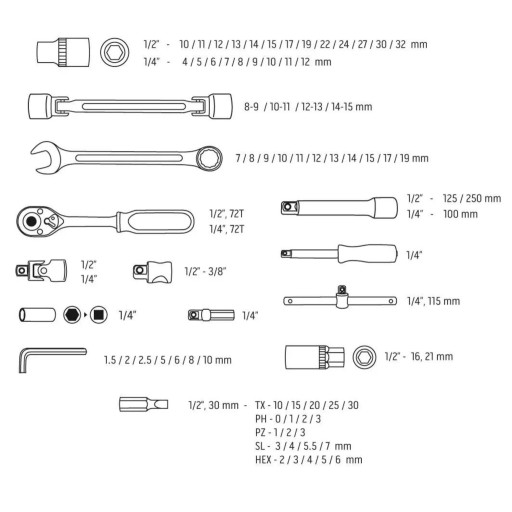 Ilość elementów pozwala na tysiące kombinacji. Wszystkie nasadki, grzechotki i klucze wykonane są z wysokowytrzymałej stali chromowo-wanadowej (Cr-V). Wszystkie końcówki wkrętakowe wykonane ze stali narzędziowej S2. Całość w odpowiednio dopasowanej, mocnej walizce z metalowymi zatrzaskami.