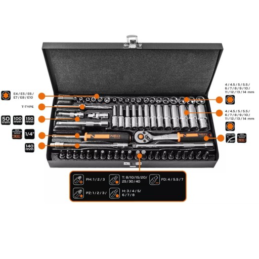 2. Klucze nasadowe 1/4", zestaw 63 szt., NEO 10-008 w stalowej kasetce