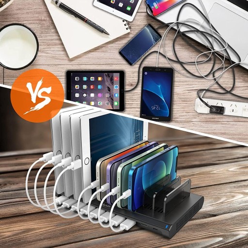 Stacja ładująca do wielu urządzeń - ładuje jednocześnie do 10 urządzeń zasilanych przez USB, szczególnie obsługuje 8 iPadów jednocześnie. Szybkie ładowanie dzięki technologii BC 1.2 zapewnia moc do 5 V 2,4 A na port. Trzymaj smartfony i inne urządzenia w jednym miejscu i dbaj o porządek