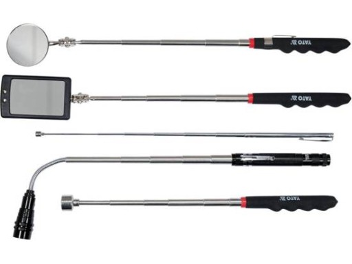 elementy wykonane ze stali zestaw zawiera 5 elementów: lusterko okrągłe o średnicy 50 mm lusterko prostokątne z 2 ledami chwytak magnetyczny długopisowy chwytak magnetyczny duży latarka z elastycznym przegubem, 3 ledami i magensem