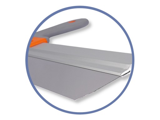 Narzędzie posiada ergonomiczny, gumowy, dwu-komponentowy uchwyt, który dobrze trzyma się w dłoni, odciążając dłoń podczas pracy. Ostrze szpachelki umieszczone jest w uchwycie aluminiowym, który jest trwale przymocowany do uchwytu za pomocą nitów, co zapewnia równomierne zużycie części roboczej.