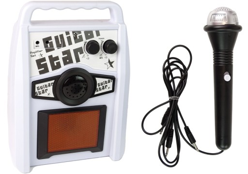 W zestawie znajduje się także biały głośnik, który się z nią łączy umożliwiając przesyłanie dźwięku na większą przestrzeń i sprawiając, że dziecko może poczuć się jak prawdziwy gwiazdor na scenie. Posiada on także uchwyt, który ułatwia jego przenoszenie.