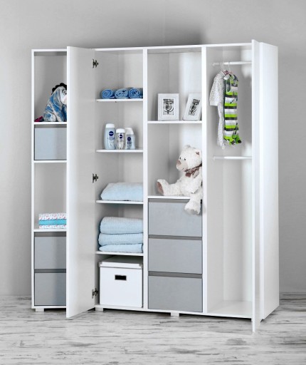 👉Szafa 3-segmentowa Dalia, która jest bardzo funkcjonalna posiada z jednej strony dużo miejsca między półkami, co sprawi, że przejrzyście ułożą Państwo ubranka swojej pociechy. Z drugiej strony szafy znajdują się dwa drążki na wieszaczki, a po środku szafy znajdują się dodatkowe półeczki i trzy pojemne szuflady na drobiazgi Waszego dziecka.