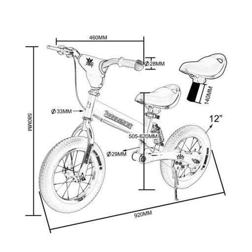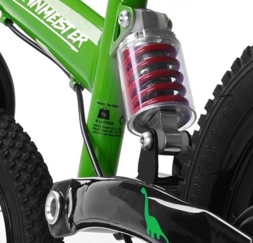 Dołączone siodełko ma wgłębienie, które zabezpiecza przed ześlizgnięciem, wyściółka zapewnia niezbędny komfort, a uchwyt w siodełku ułatwia początkowy rozruch dla mniej doświadczonych użytkowników. Antypoślizgowe gumowe uchwyty kierownicy są dostosowane dla dziecięcych rąk i zapewniają najlepszą przyczepność. Wysokość siedziska można optymalnie dostosować, dzięki czemu rower rośnie wraz z dzieckiem i może być używany w różnym wieku. Wyściółka na środku kierownicy jest wypełniona 5-milimetrowym przemysłowym buforem piankowym i zapewnia solidną ochronę przed uderzeniami. Dodatkowe wyposażenie to boczny podnóżek, hamulec ręczny - całkowicie regulowany hamulec bębnowy, stalowa rama o grubości 1,2 mm (malowana proszkowo) i szybkie zwolnienie siodełka. Podkładka siodłowa: wkładka piankowa w siodle. Zawieszenie ramy: specjalne zawieszenie w ramie.