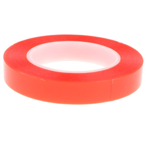 Dwustronna czerwona taśma samoprzylepna z przezroczystą folią poliestrową i mocnym klejem akrylowym, umieszczona w czerwonej przekładce polipropylenowej.