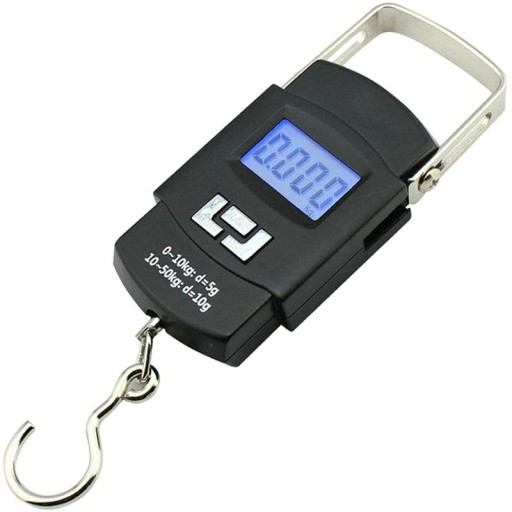 Mała, kompaktowa i wygodna waga elektroniczna z wysuwanym zaczepem. Maksymalna skala to 50kg. Możliwe przełączenie jednostki na uncje. Wyświetlacz LCD wskazuje wagę z dokładnością do 5g.