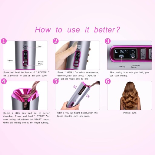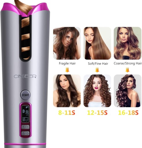 Bezprzewodowa lokówka automatyczna: Twórz piękne loki i fale za pomocą lokówki automatycznej CINSEER, twórców Curl Secret. Tę wysokowydajną lokówkę można ładować (przed pierwszym użyciem należy ją całkowicie naładować przez noc) i zapewnia do 60 minut pracy bez użycia kabla.