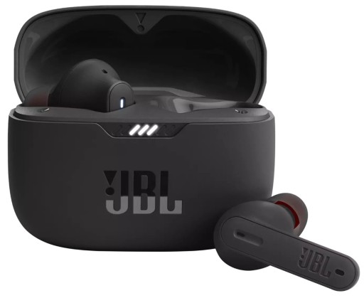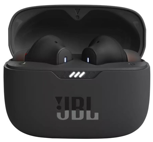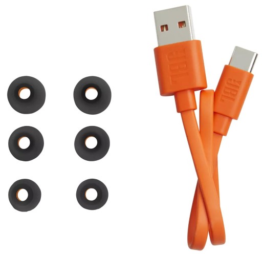 Słuchawki dokanałowe JBL Tune 235, trzy pary silikonowych nakładek, kabel USB-A/USB-C, etui ładujące (USB-C) i dokumentacja.