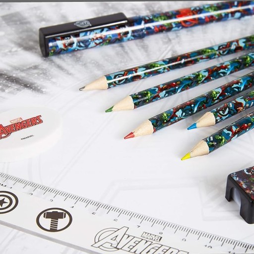ZAWARTOŚĆ ZESTAWU PRZYBORÓW SZKOLNYCH: Ten zestaw papierów zawiera 12 elementów Marvela: 4 kredki kolorowe, 1 ołówek HB, 1 linijkę 15 cm, 1 gumkę do ścierania, 1 długopis Marvela, 1 temperówkę, 1 notes A4, 1 zeszyt A5 i 1 metalowe etui Avengers.