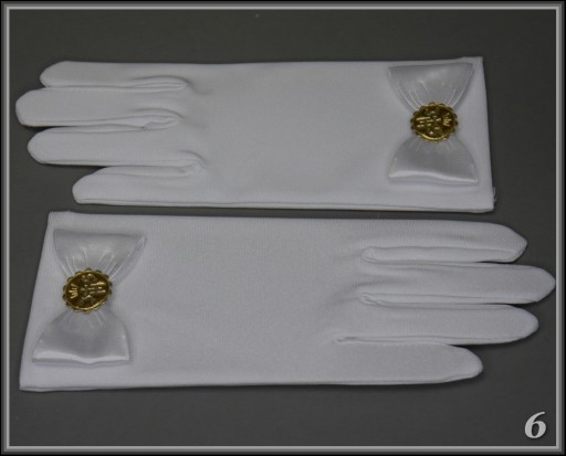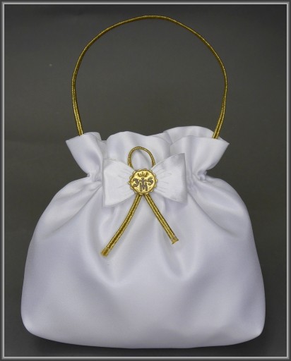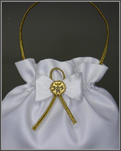 Komplet komunijny idealny do alby w składzie: Rękawiczki, okapnik z taśmy satynowej PREIUM oraz torebka komunijna z satyny atłasowej odszytej na matową stronę. Ozdobiona złotym sutaszowym sznureczkiem i złotą małą aplikacją IHS.