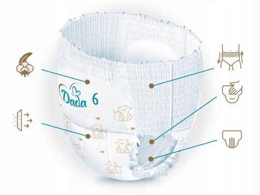 Nowe, ulepszone pieluchomajtki Dada Extra Care Pants 6 EXTRA LARGE przeznaczone są dla dzieci o wadze 16+ kg. Dada Pantsy z pomocą innowacyjnej technologii SeconDRY niezwykle szybko dystrybuują wilgoć do wnętrza pieluszki, trzymując ją z dala od skóry Twojego dziecka i zapewniając jej natychmiastową suchość – teraz jeszcze lepsze dzięki 10% większemu wkładowi chłonnemu, 20% szerszym pieluchomajtkom oraz ulepszone falbanki zapewniają jeszcze lepszy komfort oraz ochronę przeciw wyciekaniu w każdej pozycji. Nowe Dada Pants to 3 razy lepszy komfort noszenia i ochrona przed przeciekaniem. Pieluchomajtki są niezwykle miękkie, elastyczne i łatwe do założenia i zdejmowania, pomagając Ci przyzwyczaić dziecko do bielizny i ułatwiając zarówno przewijanie, jak i naukę korzystania z nocnika. Dada Pantsy wyprodukowane są bez użycia chloru cząsteczkowego ani substancji zapachowych, aby zminimalizować ryzyko reakcji alergicznej skóry. Nie zaburzają równowagi mikrobiologicznej skóry oraz wspierają naturalną mikroflorę skóry dzieci i niemowląt. Dada to jedyne pieluchomajtki w Polsce powstałe we współpracy z Instytutem Matki i Dziecka. Udoskonalone pantsy to 3 razy lepszy komfort noszenia i ochrona przed przeciekaniem w każdej pozycji dzięki 10% większemu wkładowi chłonnemu, 20% szerszym pieluchomajtkom oraz ulepszonym falbankom. Dada Pants posiadają Identyfikator wilgotności, który podpowiada, kiedy zmienić pieluchomajtki.