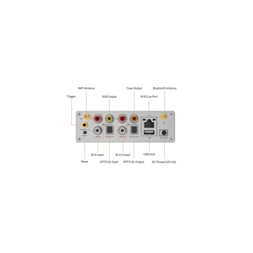 Wejście liniowe stereo RCA, wejście optyczne, host USB, port LAN RJ45 (Ethernet), wyjście stereofoniczne RCA, wyjście optyczne, wyjście koncentryczne, wyjście wyzwalacza 12 V, wyjście głośnikowe (w zestawie 4-przewodowe złącze Phoenix), wyjście Sub, Wi-Fi i Bluetooth 5.0 z obsługą AptX HD.