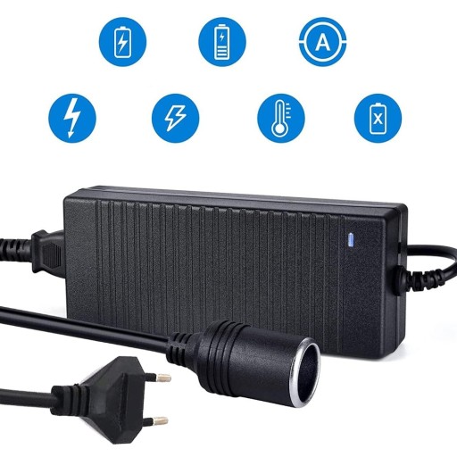 Ten zasilacz 12 V jest wyposażony w wysokiej jakości gniazdo zapalniczki. Na płytce drukowanej znajdują się trzy płytki rozpraszające ciepło, które poprawiają wydajność rozpraszania ciepła w porównaniu do konwerterów 12 V 230 V. Można go używać po podłączeniu do domowego źródła zasilania i podłączeniu gniazda cygara do wtyczki akcesorium samochodowego