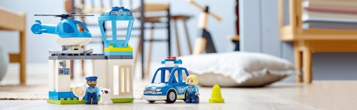 - Policyjna zabawka dla najmłodszych w zestawie LEGO DUPLO Posterunek policji i helikopter (10959) znajdziesz postacie i pojazdy inspirujące najmłodszych policjantów do pomysłowej zabawy