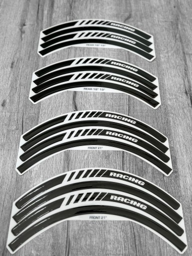 Oferta dotyczy kompletu naklejek zabezpieczających i ozdobnych na felgi do motocykli enduro 21' i 18’ lub 19’ ( bardzo wytrzymały matriał)