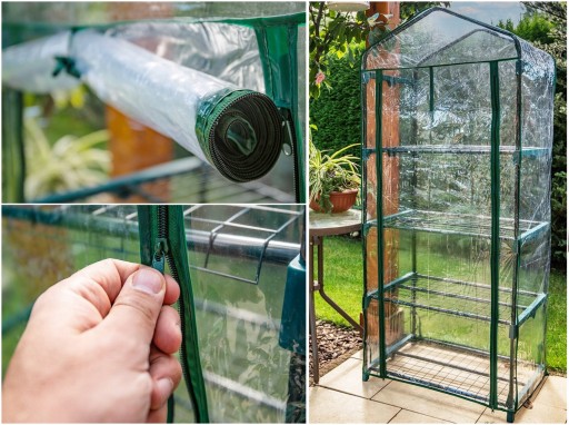 Otwarcie na suwak umożliwia wygodny dostęp do wnętrza, a także wentylację. Folię można także podwinąć, co ułatwia pielęgnację upraw. Wewnątrz szklarni znajdują się 4 poziomy, zapewniające dużo przestrzeni na ustawienie roślin.