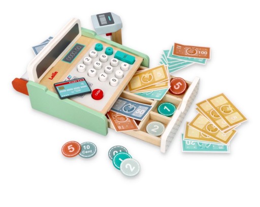 Drewniana kasa sklepowa od LELIN wprowadzi twoje dziecko w ekscytującą zabawę jako kasjer lub sprzedawca w supermarkecie, rozwija wyobraźnię i fantazję, wspomoże naukę liczenia, nauczy jak posługiwać się pieniędzmi, wzbogaci umiejętności społeczne. Guziki na kasie są ponumerowane a a przodu znajduje się wysuwana szufladka. Sprzęt pomoże rozwinąć u dziecka logiczne myślenie i zdolności manualne. Dodatkowo pomoże zrozumieć wartość pieniądza i podstawy matematyki.