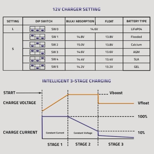 możemy dopasować tryb ładowania, zgodny z posiadanym typem akumulatora np. ładowanie akumulatorów kwasowo-ołowiowych SLA / żelowych / AGM / flooded / wapniowych i LiFePO4 oraz