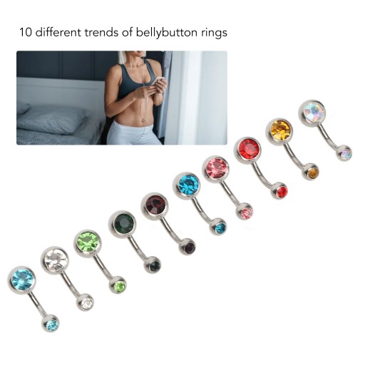 2. Pakiet zawiera: Każdy zestaw zawiera 10 szt. Pierścionków do pępka ze strasami, co daje wiele możliwości dopasowania do każdego stroju lub różnych miejsc.
