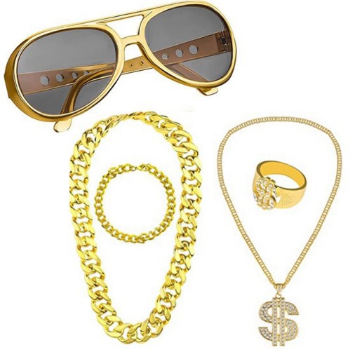⭐ Nasz złoty kostium z akcesoriami to doskonały sposób na podkreślenie swojego stylu podczas imprez, karnawałów czy Halloween. Zawiera złoty łańcuszek, pierścionek i naszyjnik z widocznym znakiem dolara oraz eleganckie vintage okulary.
