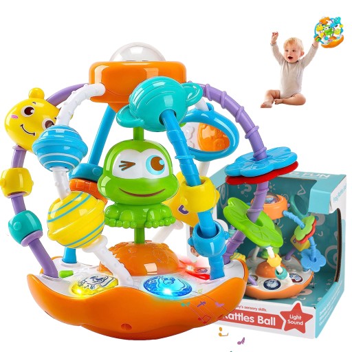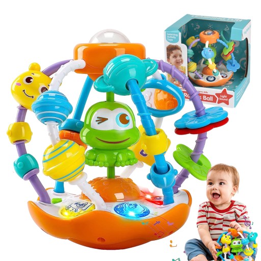 Urocza żabka mruga radośnie, śliczna kuleczka z koralikami do obracania, maleńkie bezpieczne lusterko kusi nieśmiało, a do tego wesołe dźwięki zwierzątek, melodyjki, kolory i światełka!